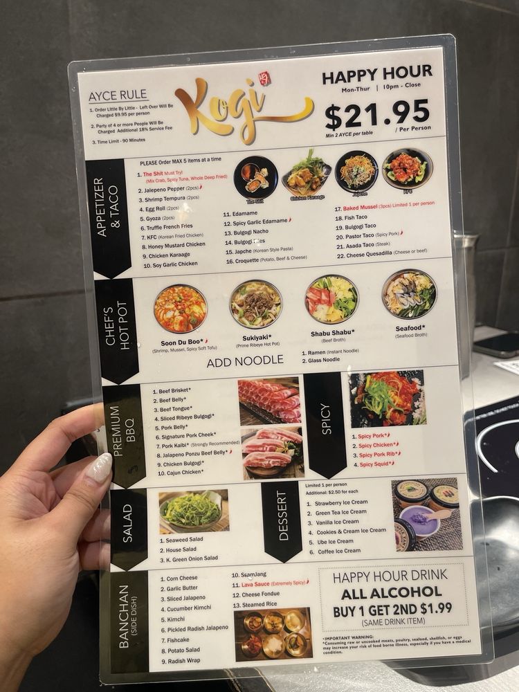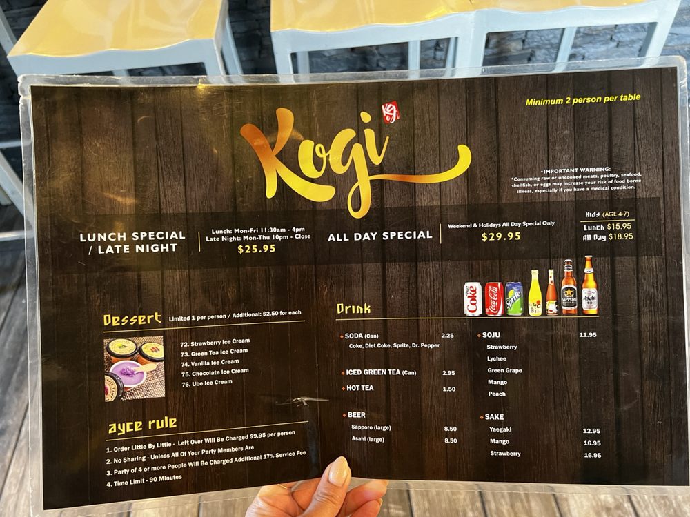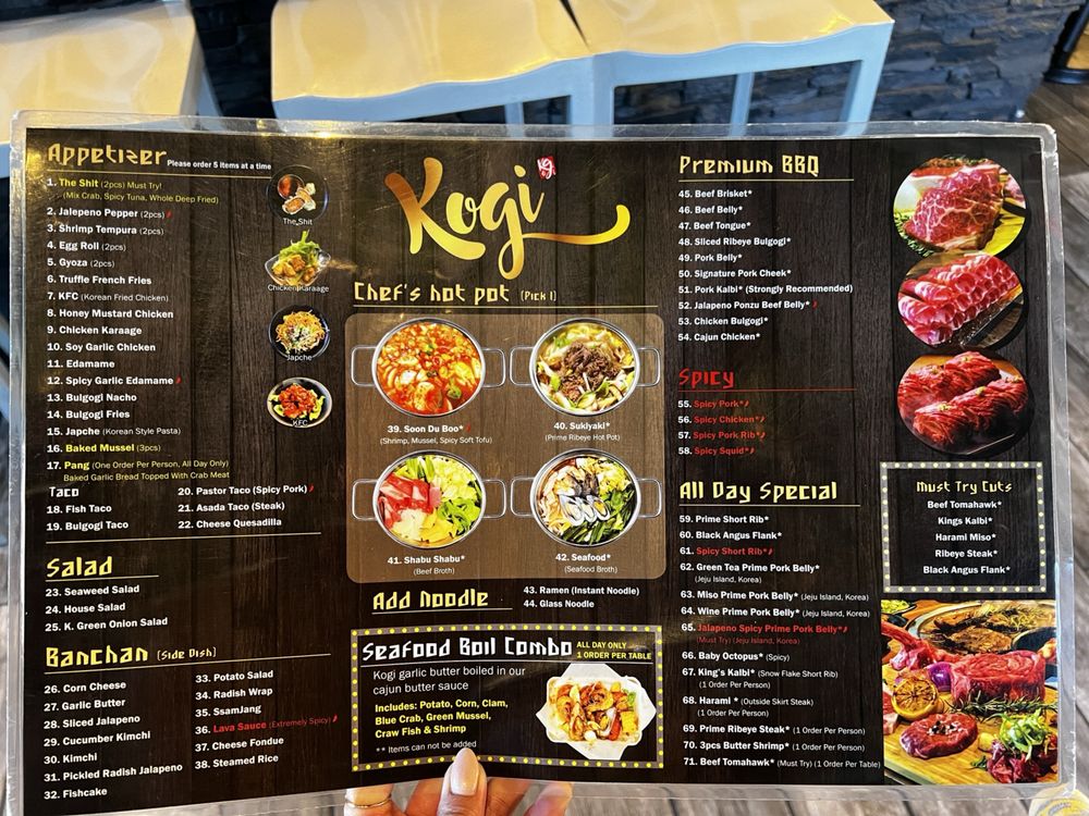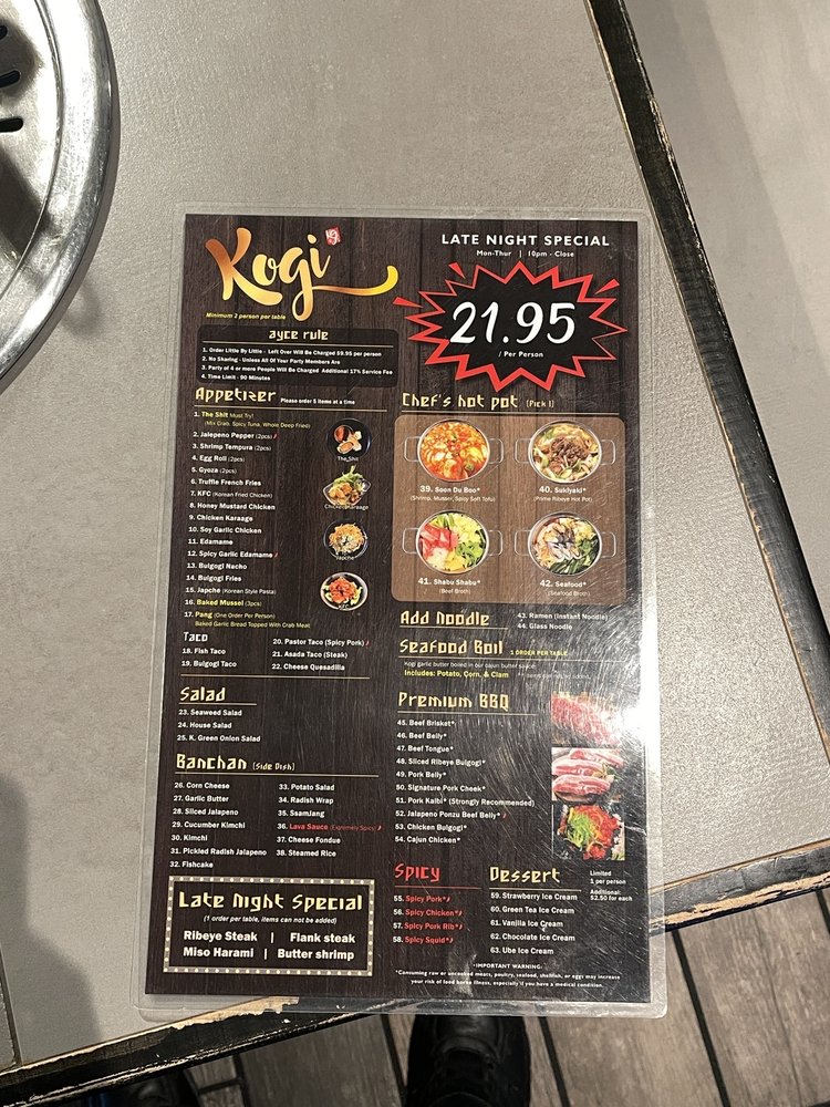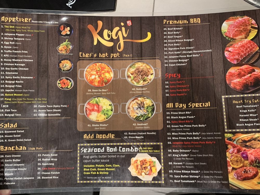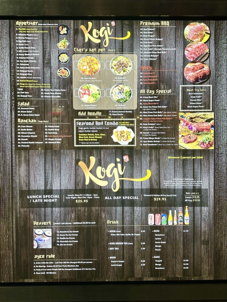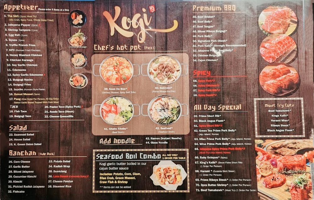 Introducing the menu at Kogi Korean BBQ, located in Las Vegas, NV, offers a variety of options in the Hot Pot, Seafood, and Korean categories. Their signature dishes include the Kogi Platter with choices like New York Steak, Beef Bulgogi, Chicken Bulgogi, and Fried Chicken Karaage. For a larger group, the Kogi Double and Triple Platter offer a selection of premium meats and sides. Premium steak, pork belly, brisket, and beef bulgogi are available on the meat selection menu. Sides like kimchi, cucumber kimchi, fish cake, bean sprout, pickled radish, pickled onion, white rice, spicy tofu soup, KFC (Korean Fried Chicken), and gyoza complement the main dishes. Customers rave about the delicious food, great service, and vibrant atmosphere at Kogi Korean BBQ, making it a must-visit dining destination in Las Vegas.
