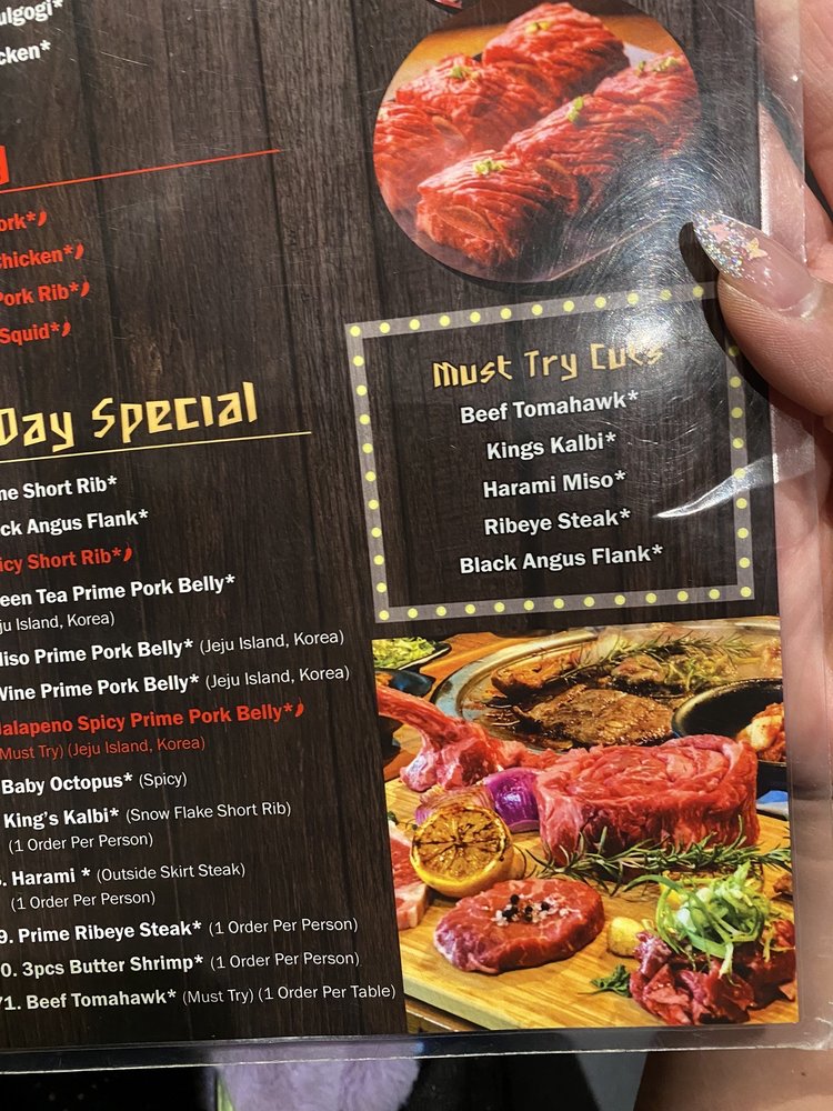 meat: New York steak x2, tomahawk x2, filet mignon, marinated galbi (short rib), beef bulgogipork belly, cajun chicken, jalapeno chicken, spicy pork, chef choice combo meat (traditional Korean style)side : spicy tofu soup appetizer: KFC (Korean Fried Chicken), honey chicken , gyoza, the shit side : garlic butter, kimchi, pickled radish, cucumber kimchi, pickled onion, fish cake, bean sprout, assorted vegetable, rice x4