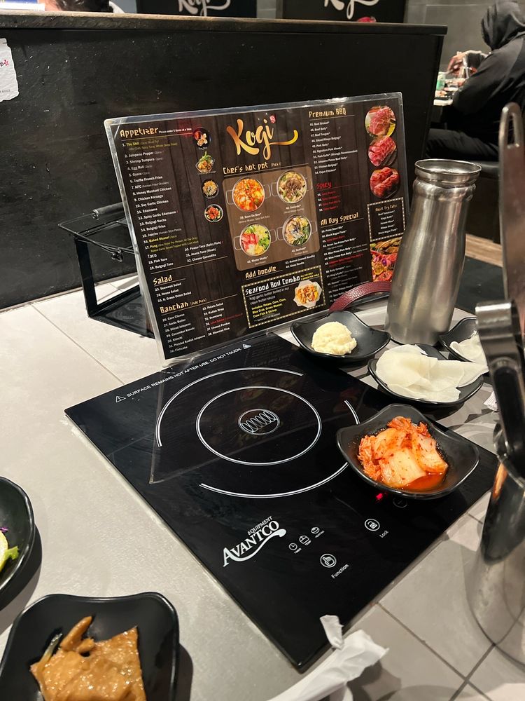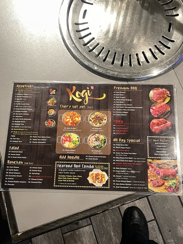 meat: New York steak, tomahawk, filet mignon, marinated galbi (short rib), beef bulgogipork belly, cajun chicken, jalapeno chicken, spicy pork, chef choice of meatside : spicy tofu soup appetizer: KFC (Korean Fried Chicken), honey chicken , gyoza, the shit side : garlic butter, kimchi, pickled radish, cucumber kimchi, pickled onion, fish cake, bean sprout, assorted vegetable, rice x3